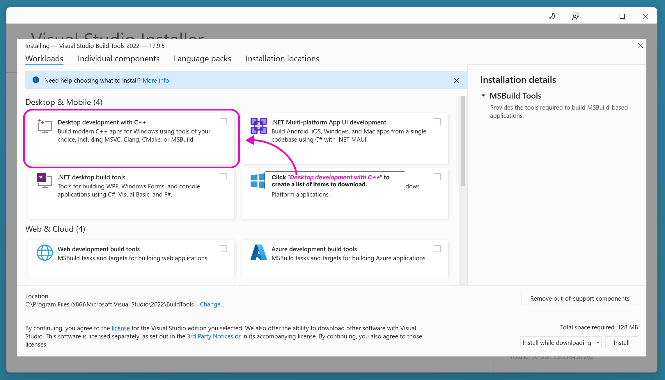 We are only interested in C++ so select "Desktop development with C++" to prepare a list of installs that we are interested in: